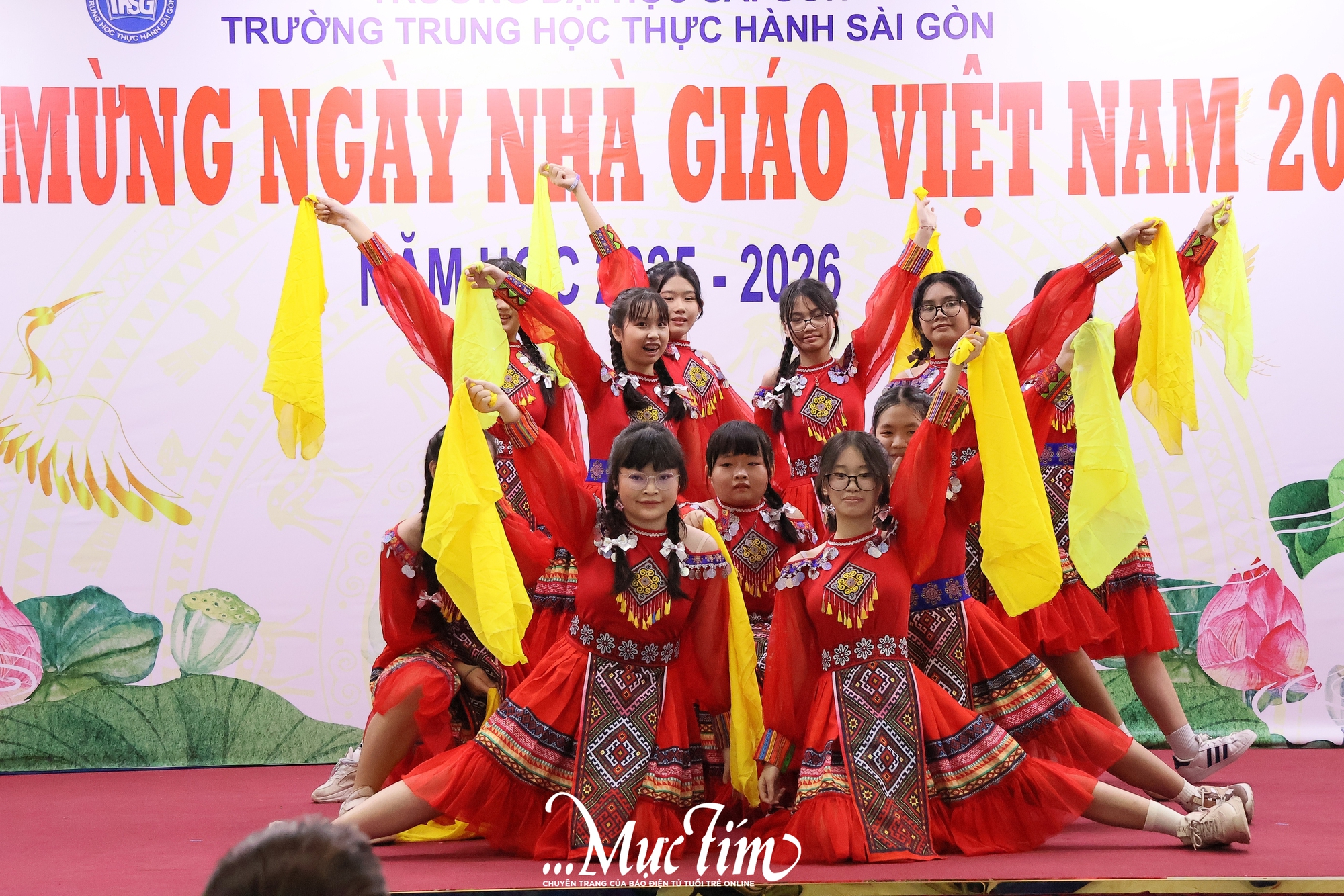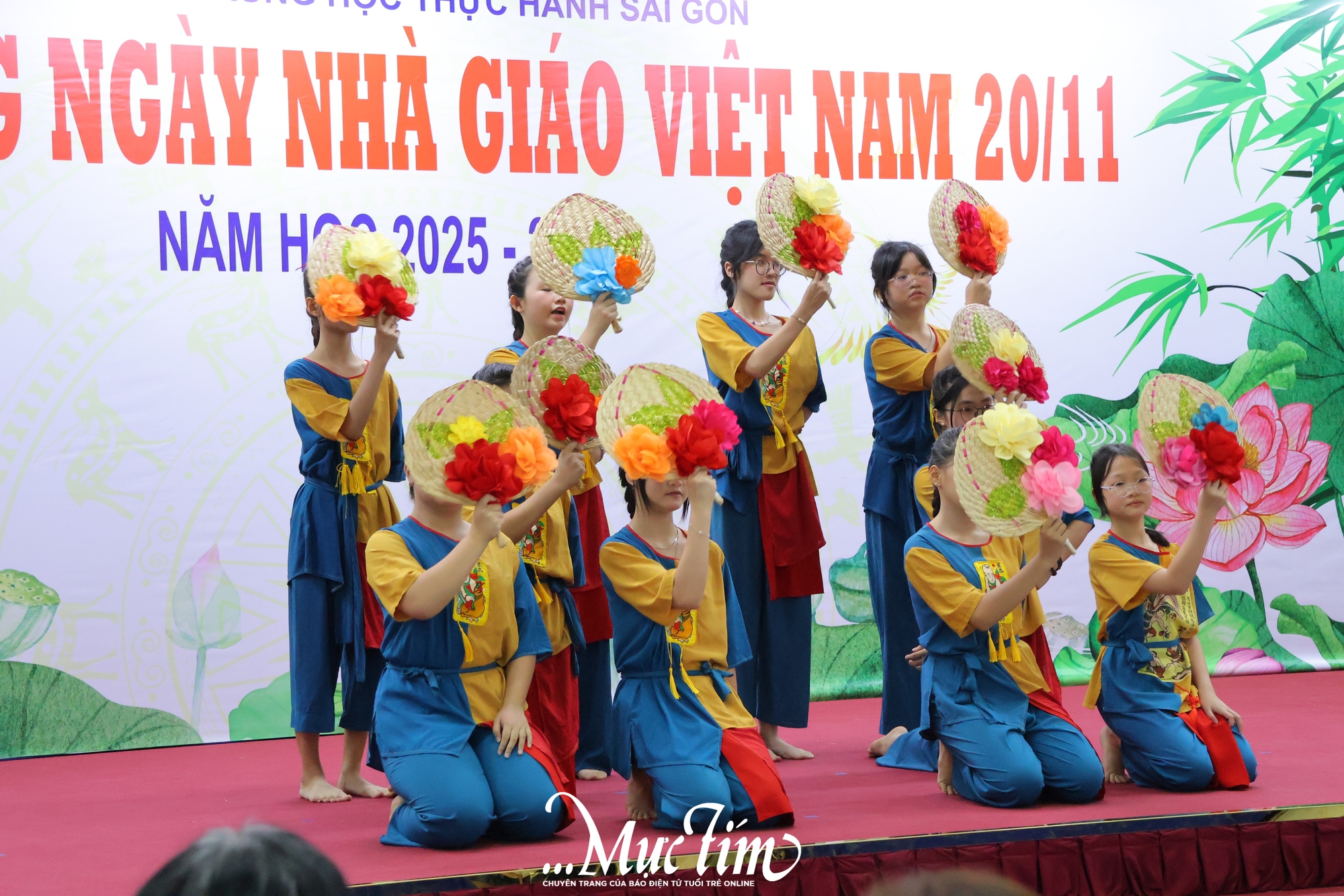 Hình ảnh bông hoa tri ân xuất hiện xuyên suốt trong những lời ca tiếng hát, điệu múa và hoạt động tặng hoa cài áo chính là những lời chúc đầy tình cảm mà học trò Trường Trung học Thực hành Sài Gòn gửi đến thầy cô.